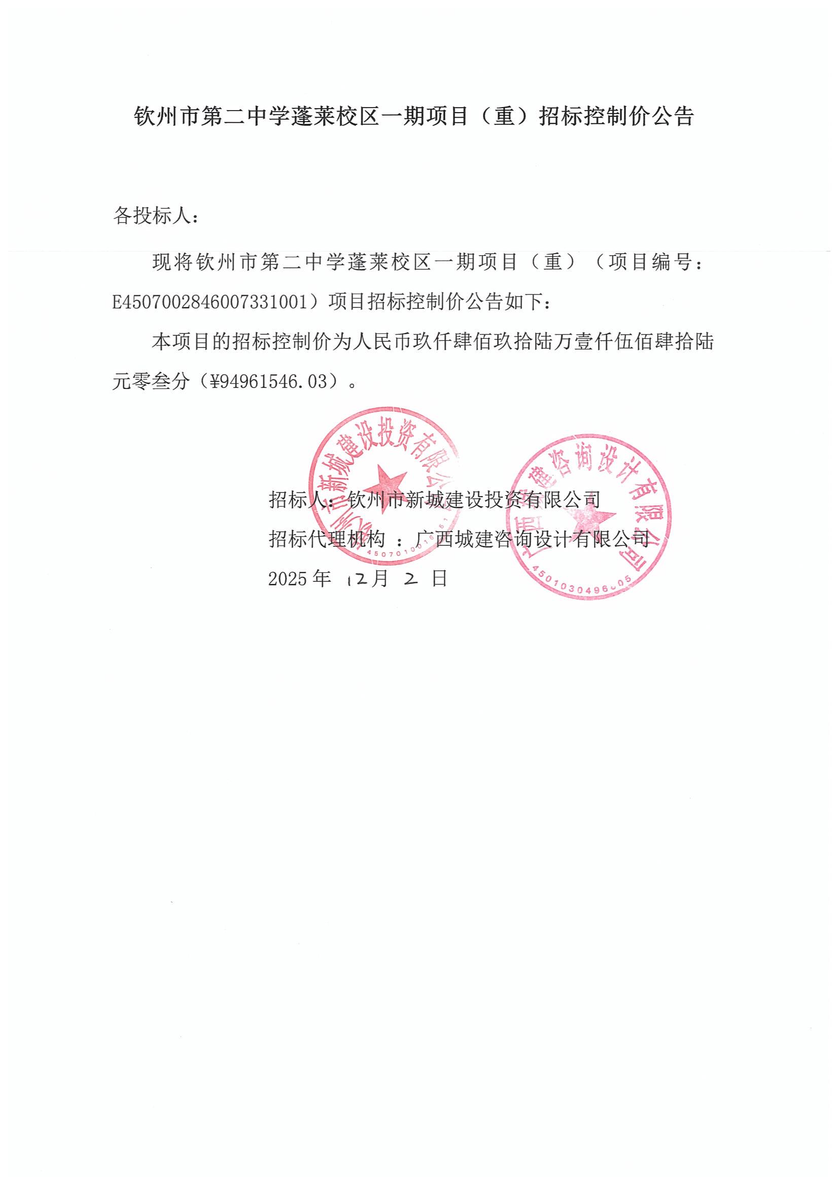 欽州市第二中學(xué)蓬萊校區(qū)一期項(xiàng)目(重)招標(biāo)控制價(jià)公告