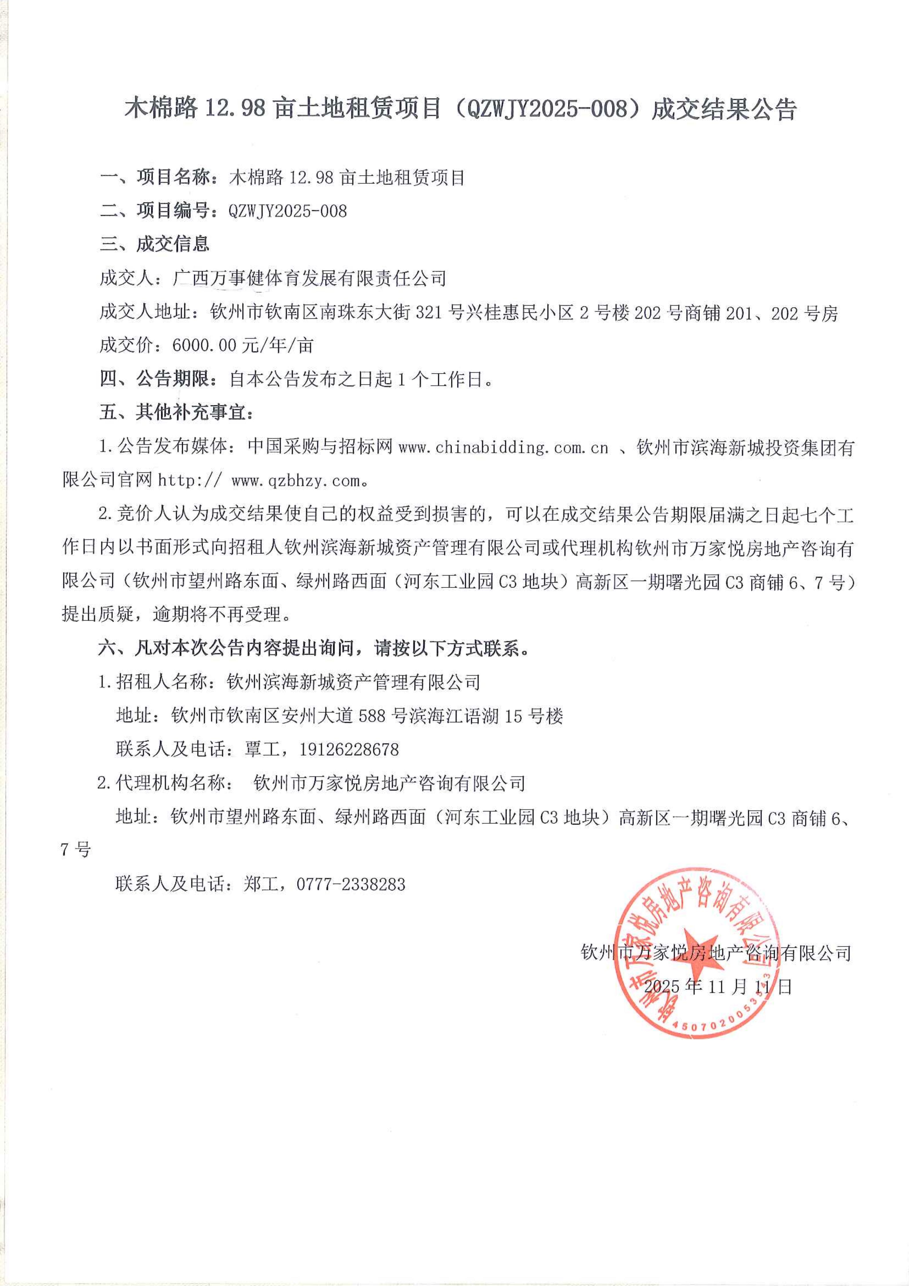 木棉路12.98畝土地租賃項目(QZWJY2025-008)成交結(jié)果公告