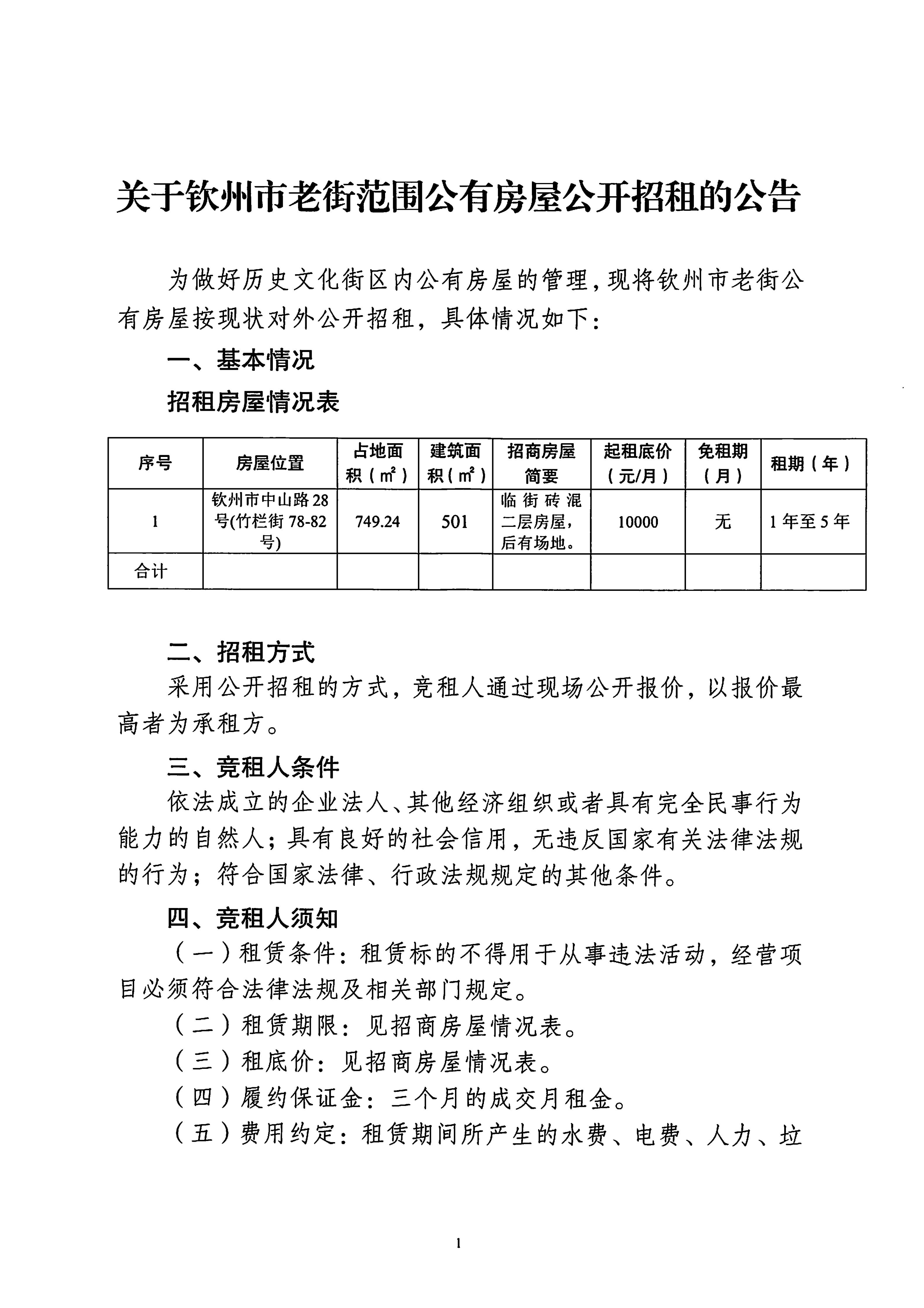關(guān)于欽州市中山路28號竹欄街78-82號房屋公開招租的公告